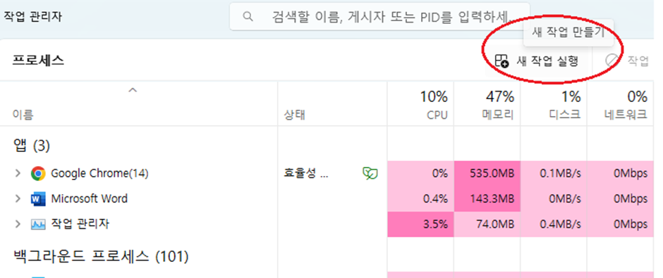 혹시 Windows 탐색기를 다시 시작할 수 없다면, 작업 관리자에서 새 작업 실행을 클릭하고 explorer.exe를 입력한 후 엔터를 누릅니다.