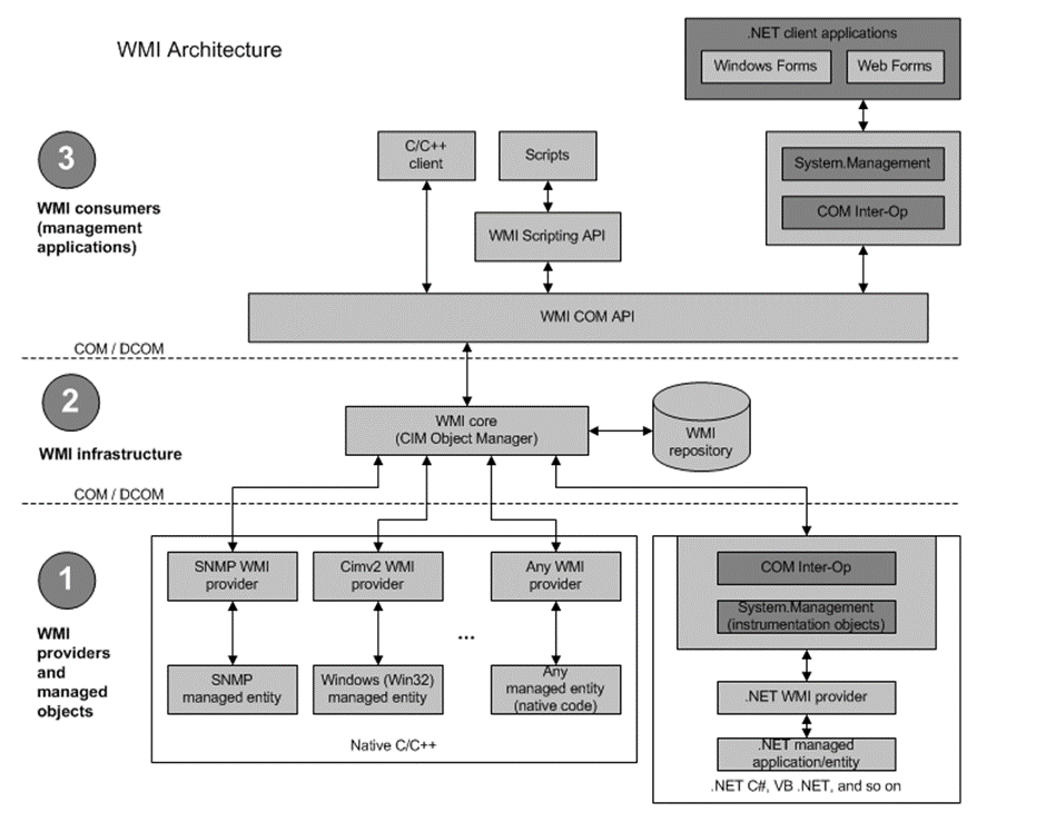 WMI는 다양한 프로바이더가 제공하는 정보를 읽어 사용자에게 전달하는 시스템 관리 인프라입니다. WMI Infrastructure는 WMI core와 WMI repository로 이루어집니다.