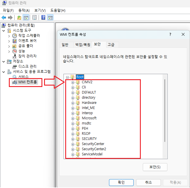 GUI를 통해서 WMI의 네임스페이스를 탐색해 보겠습니다. 컴퓨터 관리를 여세요. 컴퓨터 관리 > 서비스 및 응용 프로그램 > WMI 컨트롤을 선택하고 마우스 오른쪽 버튼 > 속성을 클릭하여 WMI 컨트롤 속성 창을 열고 보안 탭으로 이동하면 네임스페이스를 확인할 수 있습니다.